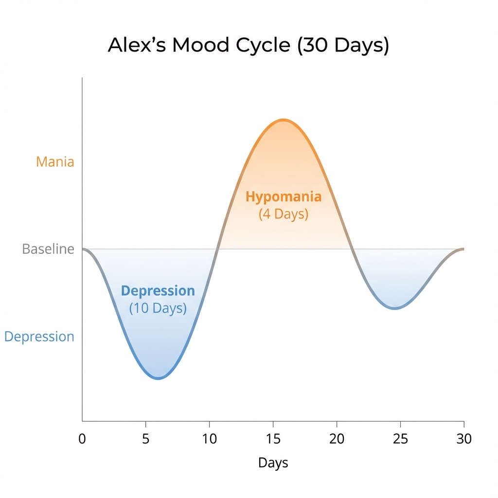 Compare this to an ADHD mood pattern (not shown), which would be dozens of tiny spikes within a single day, triggered by specific events (video game loss, criticism, etc.). Notice how Alex’s Bipolar pattern has sustained states lasting days, not hours.