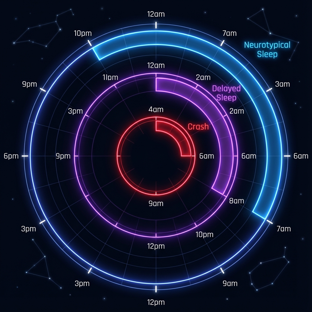 Notice how the AuDHD+Bipolar teen’s sleep window shrinks to 2 hours during mania. This is not “just” ADHD—this is a medical emergency.